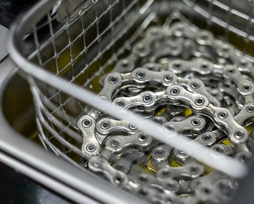 Bien que la méthode industrielle traditionnelle fixe une durée minimale de dégazage basée sur la résistance mécanique, chez BikeDoctor, le dégazage est géré par une approche mécanique : Le nettoyage par ultrasons.