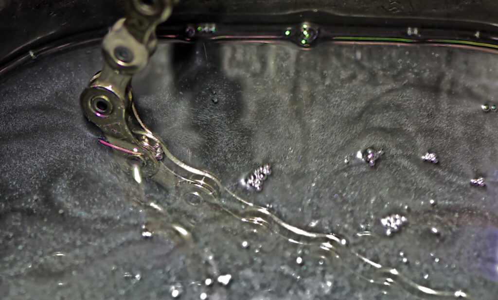 L’étape cruciale pour la durée de vie est d’observer le dégazage complet de la chaîne : lorsque l’air s’échappe des maillons, la cire chaude prend sa place par capillarité dans les interstices des rouleaux et des axes, assurant le traitement et la réduction maximale des frictions.